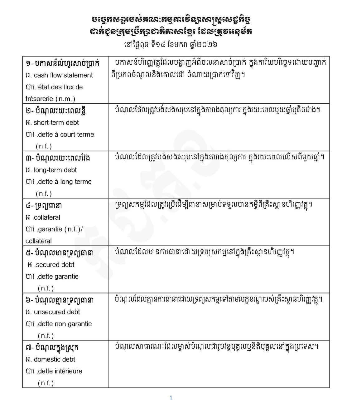 នៅពេលព្រឹកនិងរសៀលថ្ងៃពុធ ១១រោច ខែបុស្ស ឆ្នាំម្សាញ់ សប្តស័ក ព.ស.២៥៦៩ ត្រូវនឹងថ្ងៃទី១៤ ខែមករា ឆ្នាំ២០២៦ ក្រុមប្រឹក្សាជាតិភាសាខ្មែរ ក្រោមអធិបតីភាពឯកឧត្តមបណ្ឌិត ហ៊ាន សុខុម បានបើកកិច្ចប្រជុំដើម្បីពិនិត្យ ពិភាក្សានិងអនុម័តបច្ចេកសព្ទរបស់គណៈកម្មការវិទ្យាសាស្ត្រសេដ្ឋកិច្ច ដោយអនុម័តមេពាក្យនិងសេចក្ដីពន្យល់បានចំនួន១៣ពាក្យ។